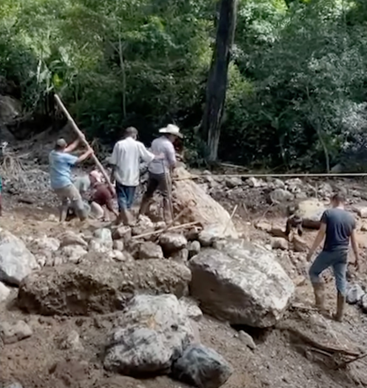 Ante la falta de ayuda externa, los propios habitantes se organizaron con palas, carretillas cuerdas y troncos de árboles derribados para remover el lodo y las grandes rocas que obstruyen lo que queda de las antiguas carreteras que hoy se reducen a veredas en las que apenas se puede pasar caminando.