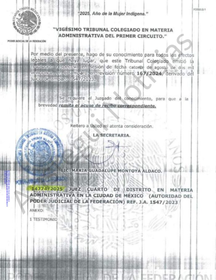 La resolución judicial fue dictada por el Vigésimo Tribunal Colegiado en Materia Administrativa del Primer Circuito el 14 de agosto de 2025, mientras que