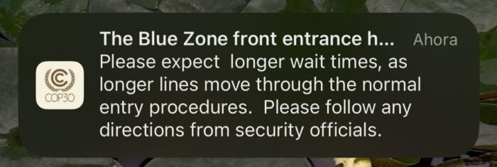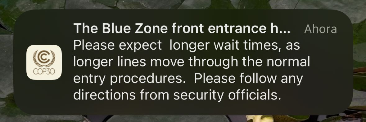 Según constata Aristegui Noticias, con presencia en la COP30, las filas y filtros se han prolongado durante horas, con la administración del evento llamando la paciencia, y reiterando que no existe ningún riesgo de seguridad para los asistentes.