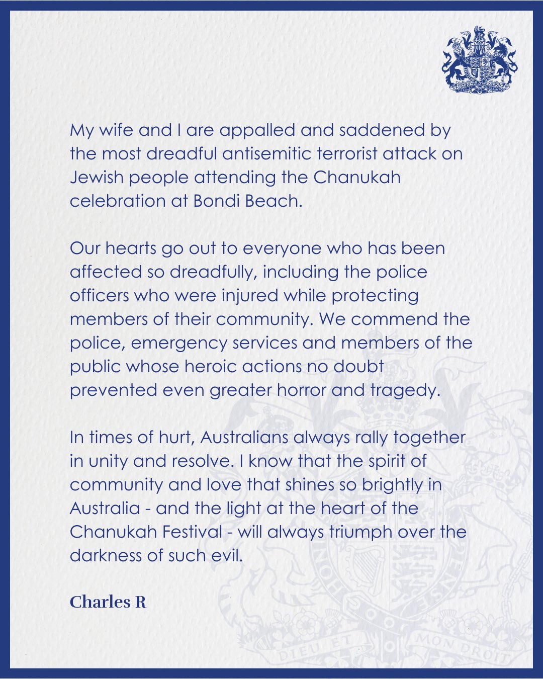 Mi esposa y yo estamos consternados y entristecidos por el terrible ataque terrorista antisemita contra judíos que asistían a la celebración de Janucá en Bondi Beach.