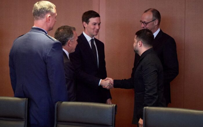 Tres horas después, llegó a la Cancillería, donde fue recibido por el jefe del Gobierno alemán, Friedrich Merz, quien, como hizo antes con Kushner y Witkoff, le condujo a la gran sala de reuniones, donde Zelenski saludó con un abrazo al representante especial de Trump y al yerno con un apretón de manos.