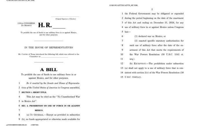 Los congresistas demócratas Joaquin Castro (Texas), Sara Jacobs (California) y Greg Stanton (Arizona) introdujeron formalmente este miércoles la ley denominada No Unauthorized War in Mexico Act (Ley contra la Guerra no Autorizada en México), la cual busca prohibir de manera explícita el uso de fondos de los contribuyentes para financiar cualquier intervención bélica o uso de la fuerza militar en territorio mexicano que no cuente con la autorización previa del Congreso de los Estados Unidos.