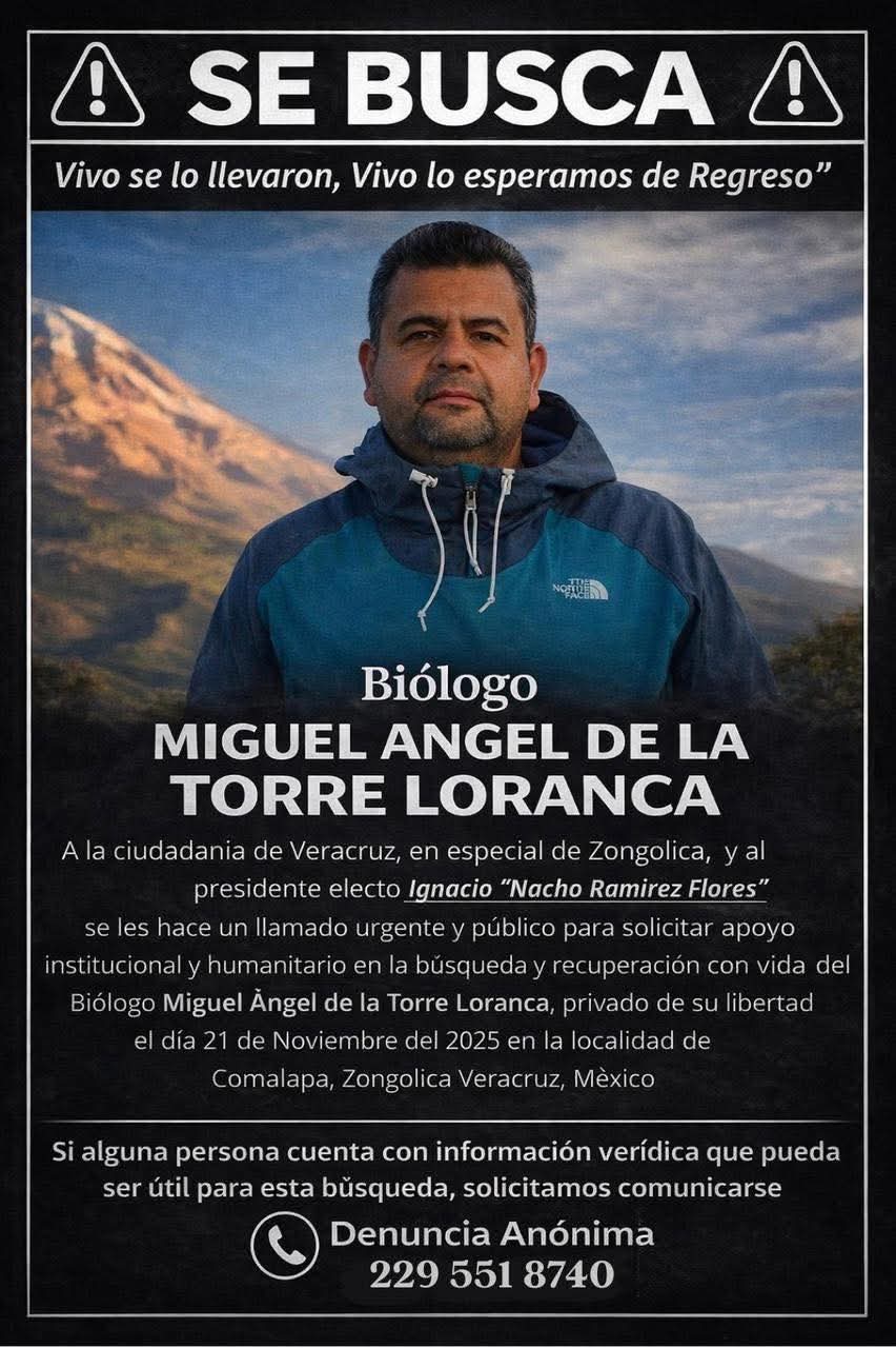 A 55 días de su desaparición, no hay rastro del activista ambiental y biólogo Miguel Ángel de la Torre Loranca, privado de la libertad el 21 de noviembre de 2025 en la localidad de Comalapa, en la Sierra de Zongolica, Veracruz.