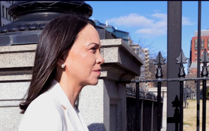 La líder opositora venezolana entró este jueves a la residencia ejecutiva estadounidense por una puerta lateral en lugar de por la entrada principal, reservada a jefes de Estado y altos dignatarios, y no respondió preguntas de la prensa.