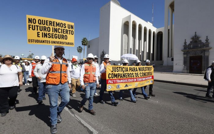 Trabajadores del sector minero, estudiantes, familiares y amigos de los mineros desaparecidos y asesinados en el municipio de Concordia, Sinaloa, marcharon el sábado en varios estados del país para exigir al Estado mexicano justicia y seguridad en esta actividad económica que representa el 2.5 % del PIB nacional.