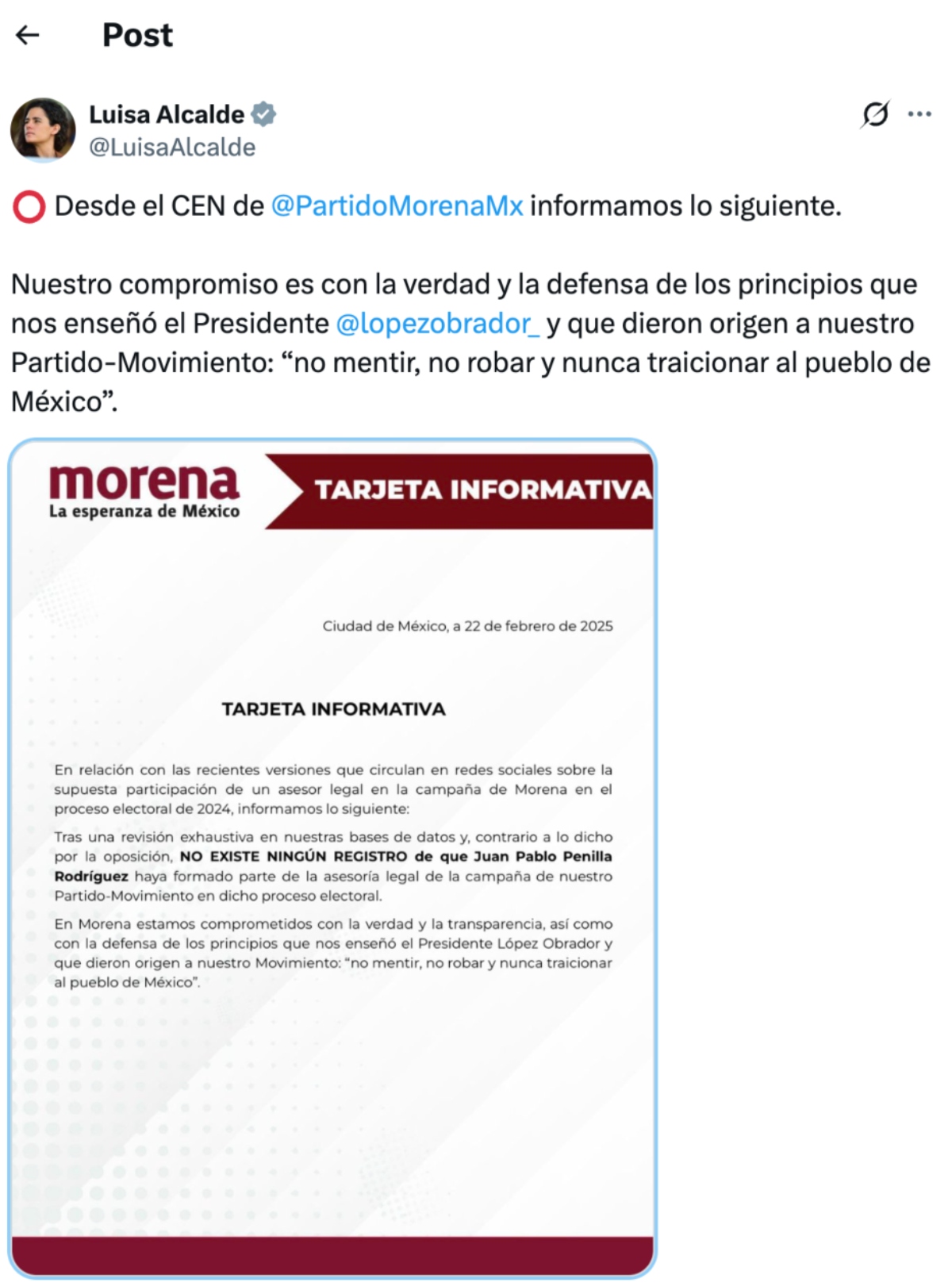 Por su parte, la presidenta de Morena, Luisa Alcalde, dijo que a pesar de las múltiples fotografías de Penilla en actos electorales de su partido, nunca fue parte de la campaña y mucho menos fue asesor legal de la misma, especulación que los opositores del gobierno actual comenzaron a esparcir