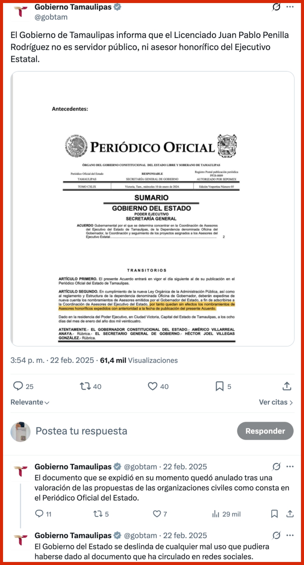 Obligada por la tormenta política, Sheinbaum se deslindó de Juan Pablo Rodríguez Penilla en su conferencia matutina del 24 de febrero de 2025, aclarando que durante su campaña presidencial se sacó miles de fotografías. Más tarde, también se conoció que el abogado apareció en un evento oficial del entonces presidente Andrés Manuel López Obrador, junto a los legisladores de Morena, Pedro Haces Barba, y Ricardo Monreal, Junto a él se encontraba su entonces socio, Sergio Arturo Ramírez, que desde el 2024 se ha deslindado de él.
