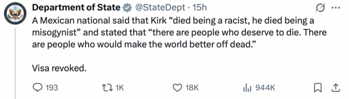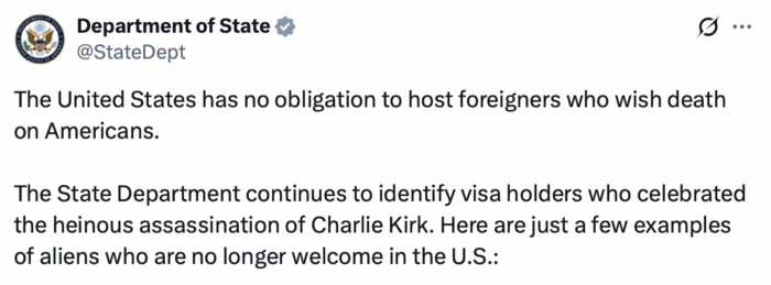 “Estados Unidos no tiene ninguna obligación de acoger a extranjeros que desean la muerte a estadounidenses. El Departamento de Estado continúa identificando a titulares de visados que celebraron el atroz asesinato de Charlie Kirk”, dijo ese departamento en X.