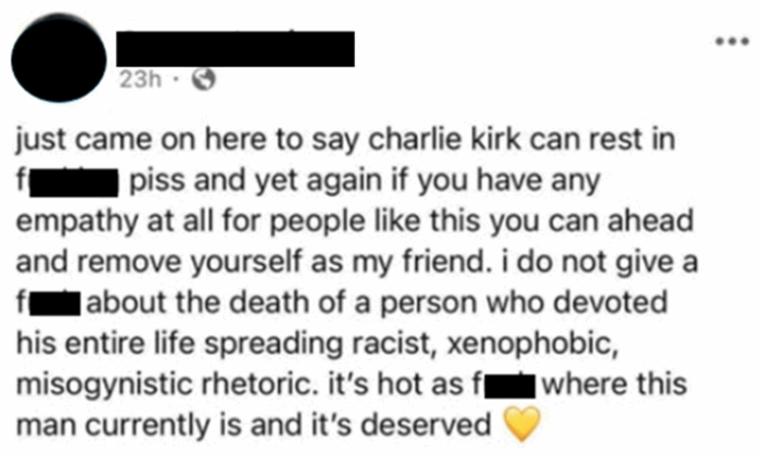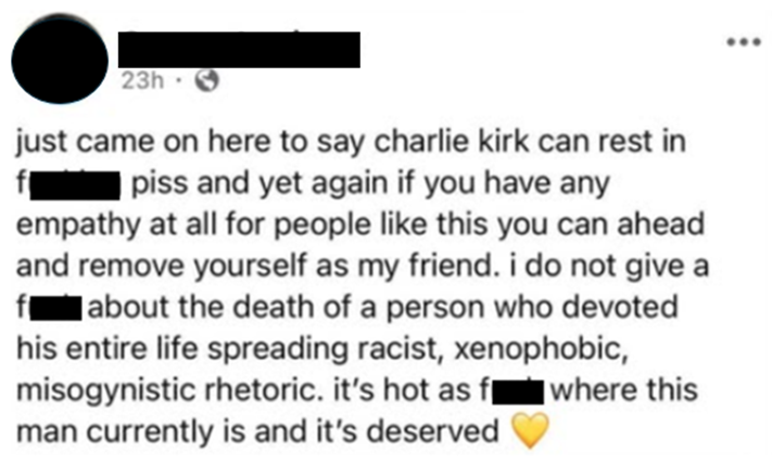 Entre los seis hay un argentino que apuntó que Kirk dedicó toda su vida a propagar una retórica racista, xenófoba y misógina y que merecía arder en el infierno. “Visa revocada”, anunció el Departamento de Estado en esa red social, que no identifica a la persona pero sí difunde el mensaje que esta colgó en X.