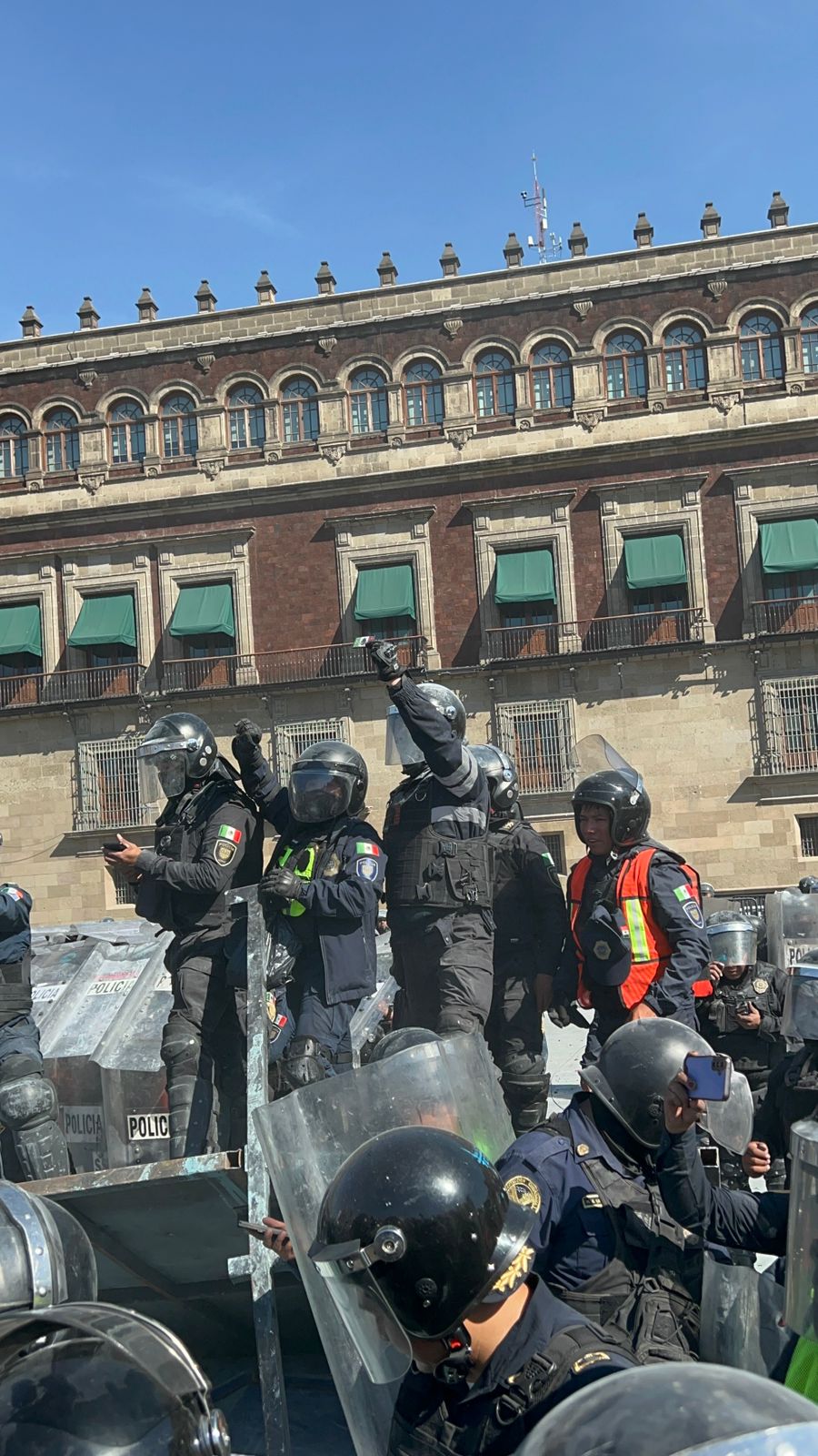 Ante el derribo de algunas de las vallas protectoras en el perímetro del inmueble, elementos de las fuerzas de seguridad han implementado estrategias de repliegue de cara a contener a los asistentes.