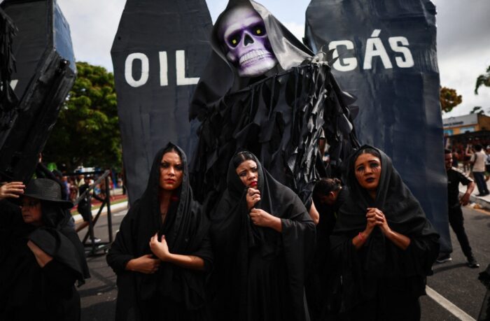 Durante la manifestación se escenificó un funeral de los combustibles fósiles con féretros gigantes para exigir una nueva era sin dependencia del petróleo, el gas y el carbón mineral a cargo de organizaciones internacionales y artistas de la Universidad Federal del Pará.