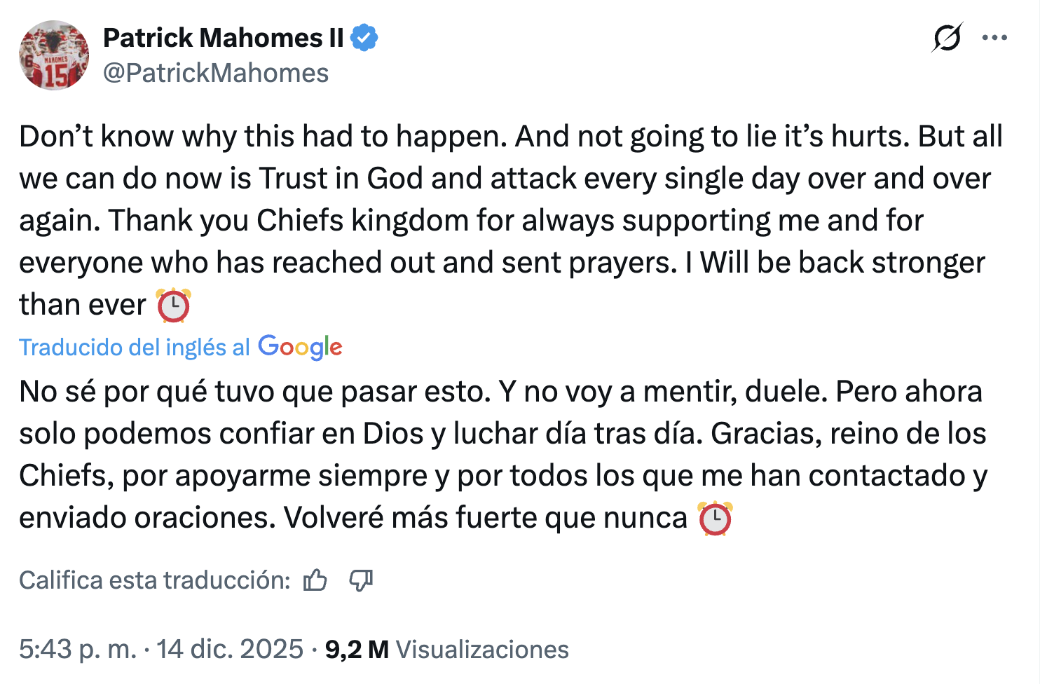 Luego de que los Chiefs informaron sobre el grado de la lesión, el tres veces Jugador Más Valioso del Super Bowl emitió un mensaje en el que prometió un regreso triunfal para el 2026.