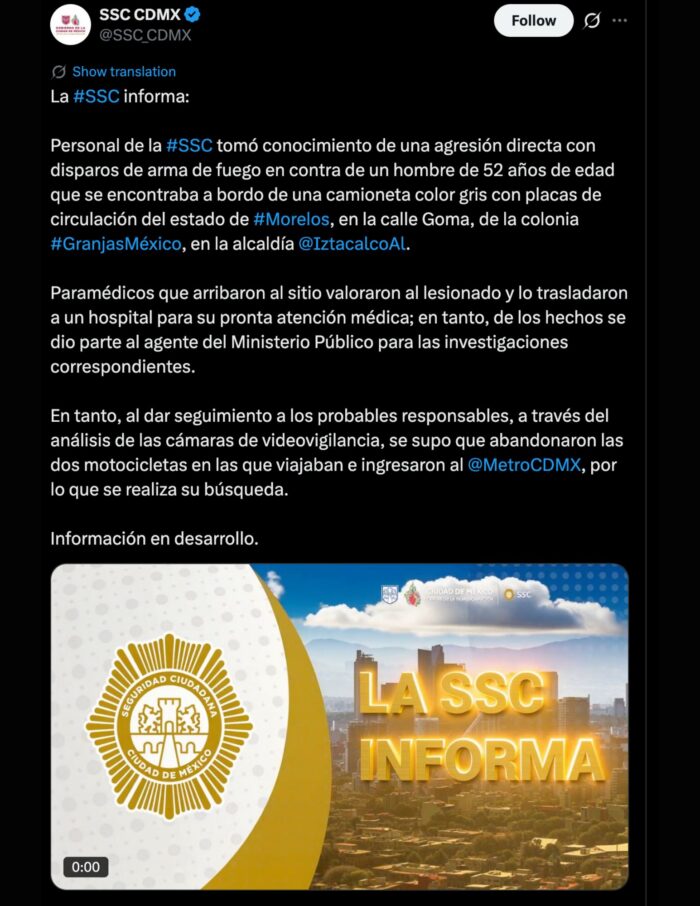 La SSC agregó que inició un seguimiento a través del análisis de las cámaras de videovigilancia cercanas al lugar del evento. Según la información oficial, los presuntos responsables abandonaron las dos motocicletas en las que viajaban e ingresaron a la Línea 9 del Metro, por lo que se mantiene activa su búsqueda.