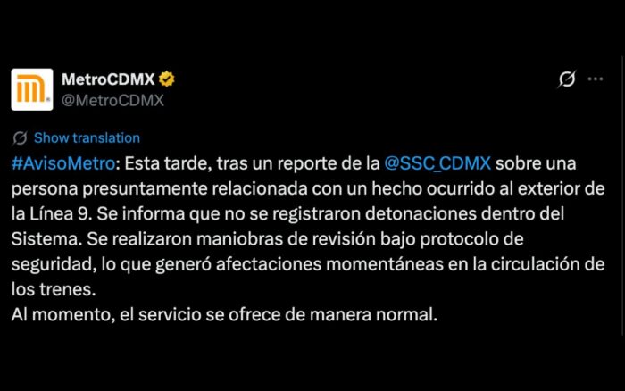 Por su parte, el Sistema de Transporte Colectivo Metro señaló que, tras el reporte de la policía, se activaron protocolos preventivos. En una publicación de redes sociales, la administración del transporte reportó que no hubo detonaciones dentro de las instalaciones y que el ataque armado ocurrió al exterior de la Línea 9.