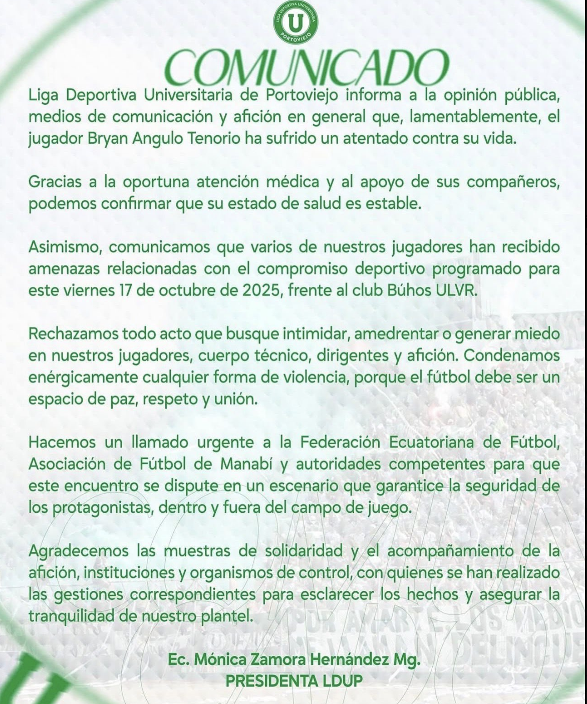 Liga Deportiva Universitaria de Portoviejo, el club de Angulo, informó en un comunicado que el fubtolista, conocido como el ‘Cuco’, fue víctima de un “atentado contra su vida”, y aseveró que gracias a la oportuna atención médica y el apoyo de sus compañeros “su estado de salud es estable”.
