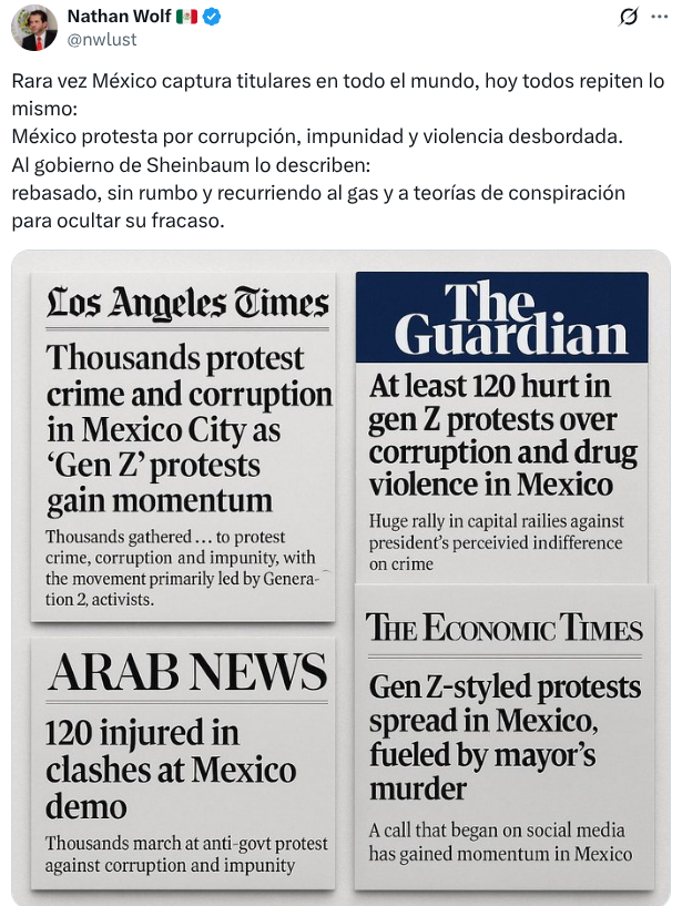 El ex embajador de México en Singapur, Nathan Wolf, publicó en su cuenta de X @nwlust una serie de publicaciones de medios internacionales, entre ellos el diario estadounidense, Los Angeles Times, y el británico, The Guardian, en las que se aborda la marcha, destacando en algunos los 120 heridos que se reportaron tras la movilización.