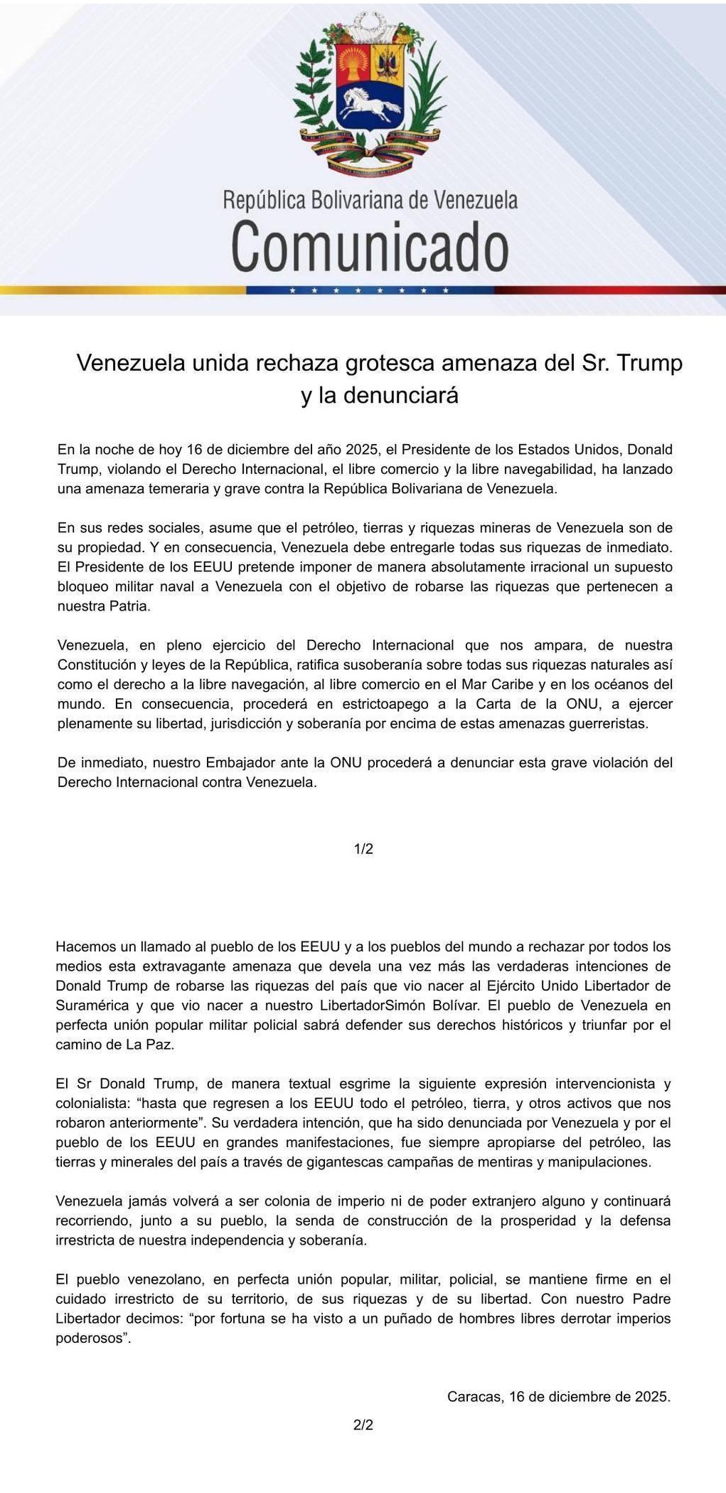 El pronunciamiento calificó estas afirmaciones como “intervencionistas y colonialistas” y señaló que Trump pretende imponer de manera “absolutamente irracional” un supuesto bloqueo naval militar contra Venezuela, con el objetivo de apropiarse de recursos que pertenecen exclusivamente al pueblo venezolano.
