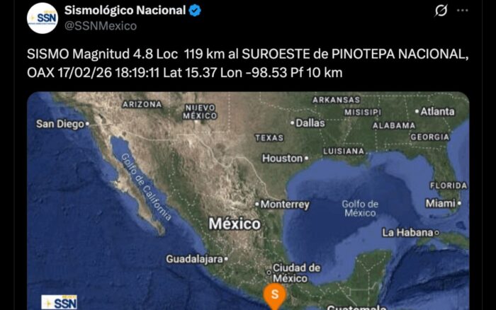 “SISMO Magnitud 4.8 Loc 119 km al SUROESTE de PINOTEPA NACIONAL, OAX 17/02/26 18:19:11 Lat 15.37 Lon -98.53 Pf 10 km”, dice el mensaje del Sismológico Nacional.