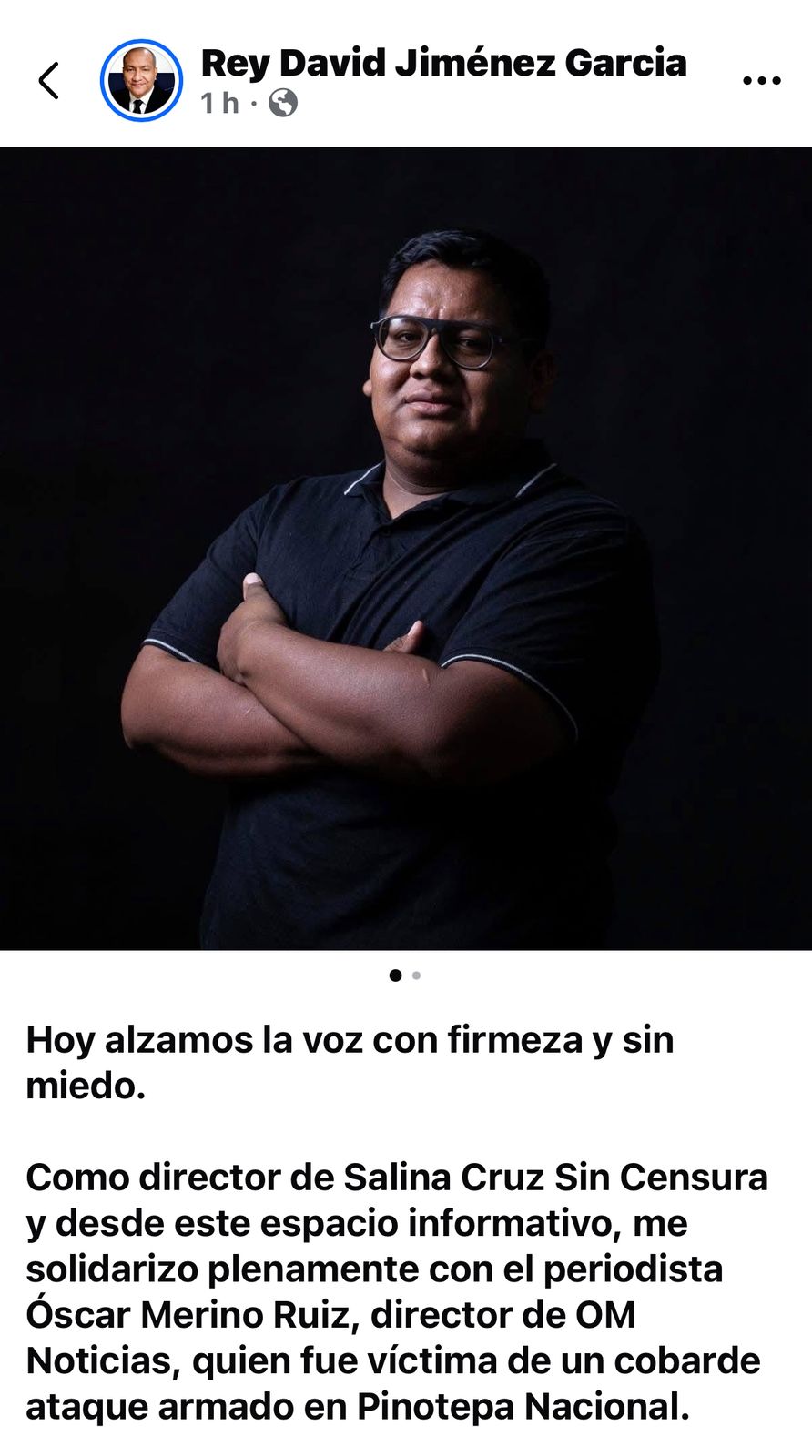 Al respecto, el reportero, Rey David Jiménez García, director del diario Salina Cruz sin Censura se solidarizó con el comunicador tras este ataque violento.