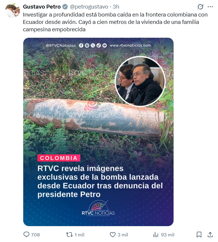 Petro agregó en una publicación una imagen de una de estas bombas que habrían sido lanzadas desde territorio ecuatoriano. “Cayó a cien metros de la vivienda de una familia campesina empobrecida”, denunció.