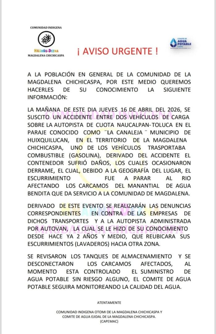 Habitantes de la comunidad indígena de Magdalena Chichicaspa, en el municipio de Huixquilucan, advirtieron que el derrame de combustible provocado por el choque de tráileres habría alcanzado un río de la zona, con posible afectación a su sistema de agua potable.
