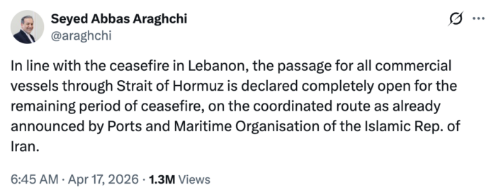 El ministro de Exteriores de Irán, Abbas Araqchi, anunció este viernes que las autoridades de la República Islámica han decidido reabrir “completamente” el estrecho de Ormuz a la navegación comercial mientras dure alto el fuego pactado con Estados Unidos.