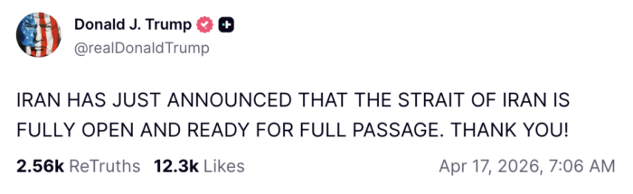 En su primera respuesta al anuncio, el presidente de Estados Unidos, Donald Trump, celebró la reapertura del paso, “listo para el tránsito total”, según reza su mensaje en sus redes sociales, en el levantamiento provisional de un bloqueo que ha permanecido en vigor aproximadamente un mes entero.