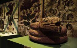 Localizada en 1985, en la antigua Casa del Marqués del Apartado, en el Centro Histórico capitalino, el Águila Cuauhxicalli aparece también como una de las esculturas de roca volcánica más sobresalientes en la exposición.