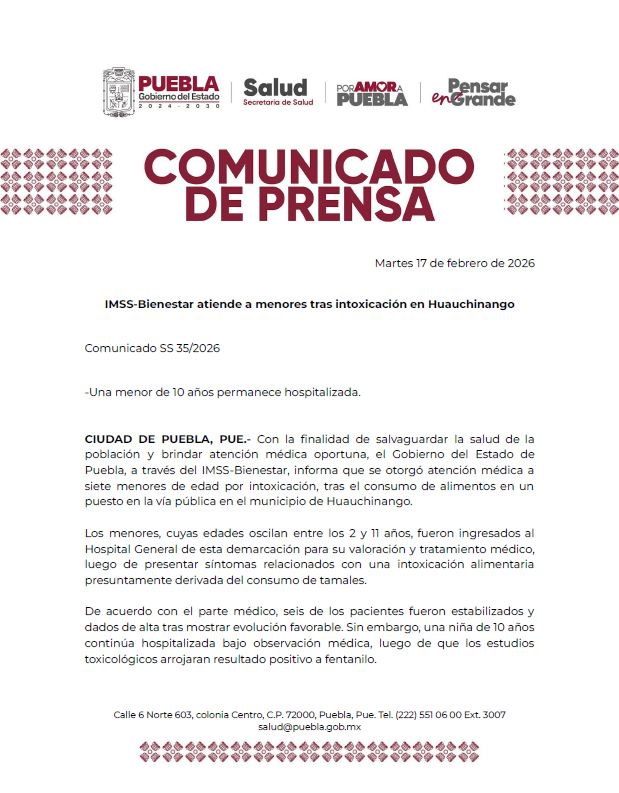 El Gobierno estatal, encabezado por Alejandro Armenta, reiteró que dará seguimiento al caso y garantizará la atención médica necesaria a los menores afectados.