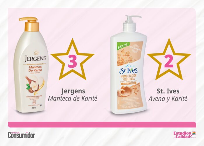 Mientras que en el tercer puesto aparece la crema corporal Jergens con karité africano de origen natural. Manteca de karité, en su presentación de 400 mililitros. El producto cumplió con el contenido neto reportado y tiene un costo promedio de 85 pesos en el mercado. Asimismo cuenta con un pH de 7.