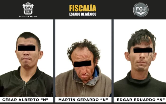 La Fiscalía General de Justicia del Estado de México (FGJEM) reportó la aprehensión de tres hombres identificados como César Alberto “N”, Martín Gerardo “N” y Edgar Eduardo “N“, investigados por su probable participación en el delito de privación de la libertad de menores en agravio de una adolescente que había sido reportada como desaparecida en el municipio de Tecámac.