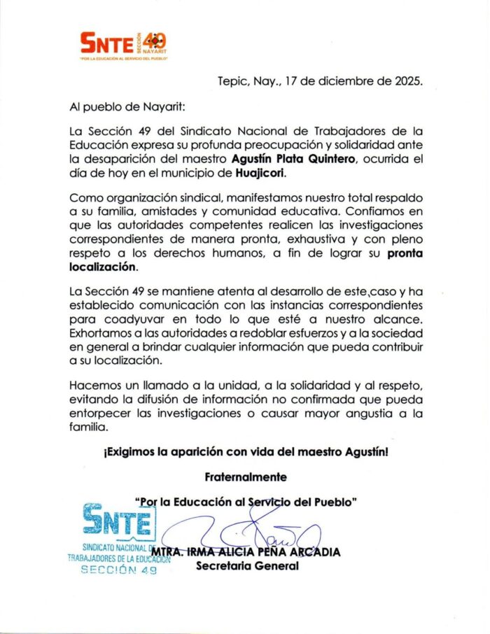 El maestro de primaria Agustín Plata Quintero fue privado de su libertad en Huajicori, Nayarit, este miércoles, confirmó el Sindicato Nacional de Trabajadores de la Educación (SNTE) que exigió su localización con vida.