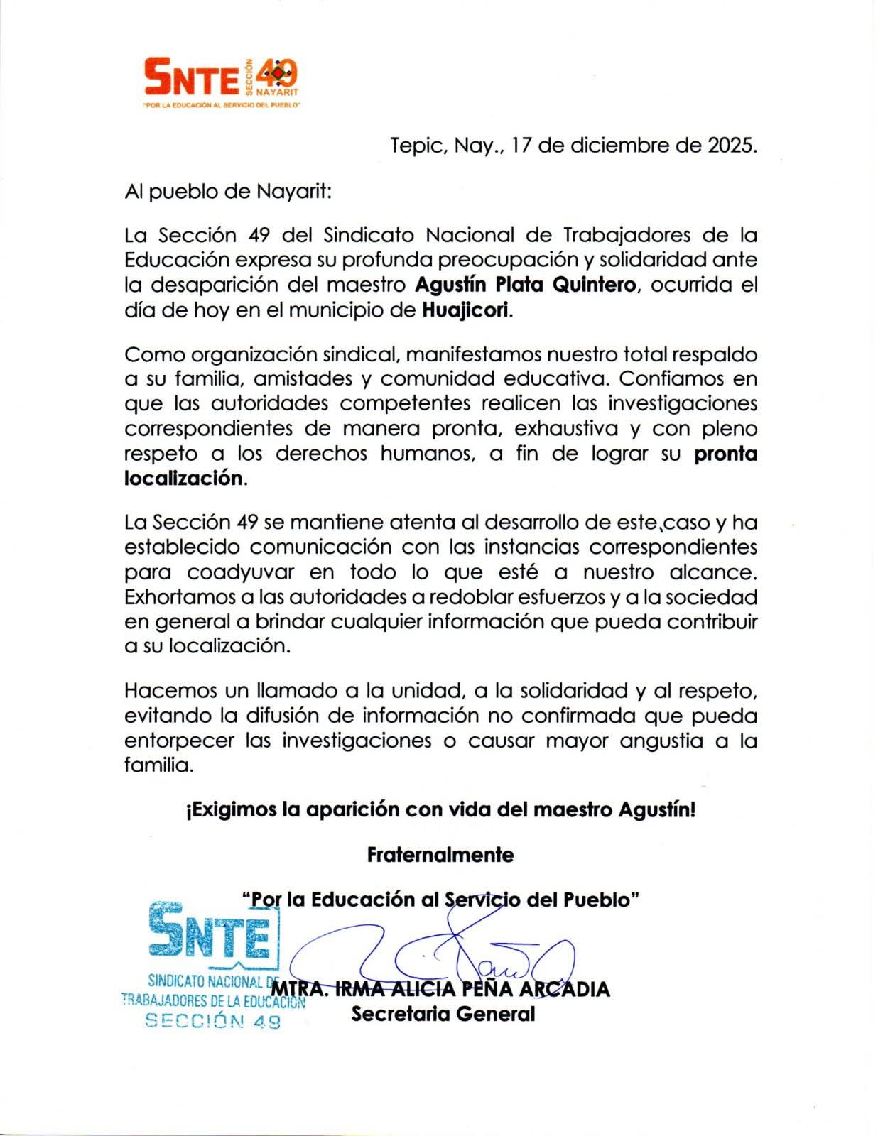 El maestro de primaria Agustín Plata Quintero fue privado de su libertad en Huajicori, Nayarit, este miércoles, confirmó el Sindicato Nacional de Trabajadores de la Educación (SNTE) que exigió su localización con vida.