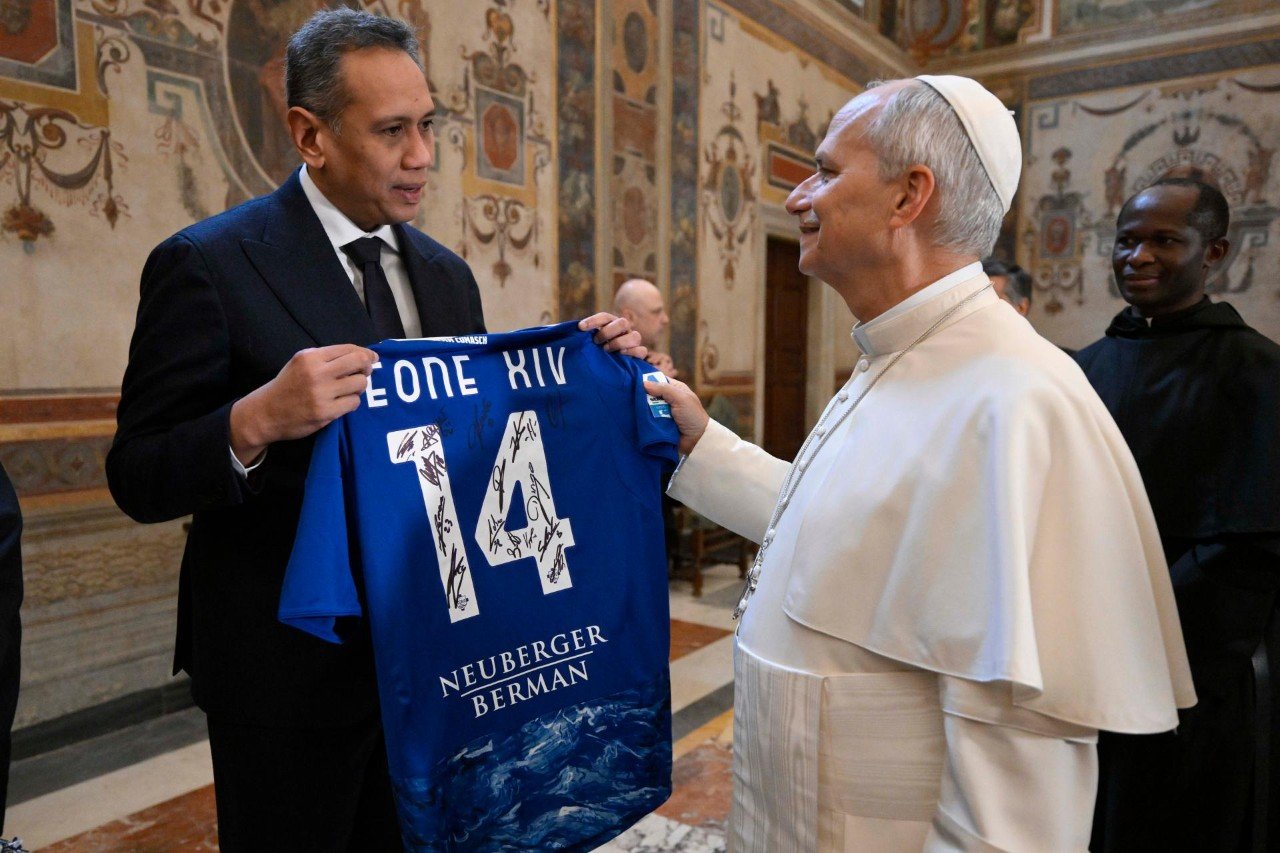 Los futbolistas, técnicos y directivos hicieron entrega al papa de una camiseta del Como con el dorsal ‘Leone XIV’ (León XIV, en italiano) y el número 14, así como un banderín y una bufanda.