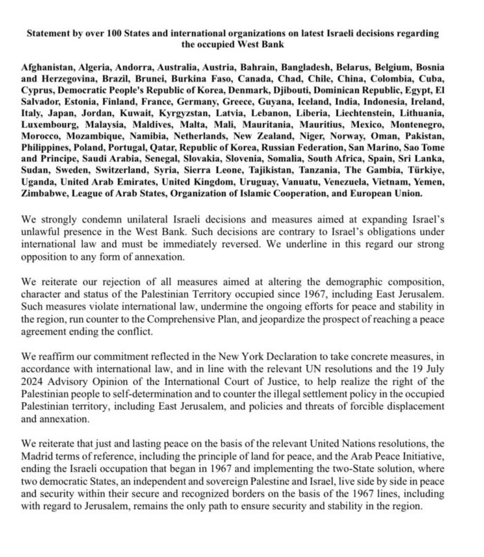 Más de 100 Estados y organizaciones internacionales, entre ellos México, emitieron una declaración conjunta en la que condenan las recientes decisiones unilaterales de Israel en la Cisjordania ocupada y rechazan cualquier intento de anexión oficializada.