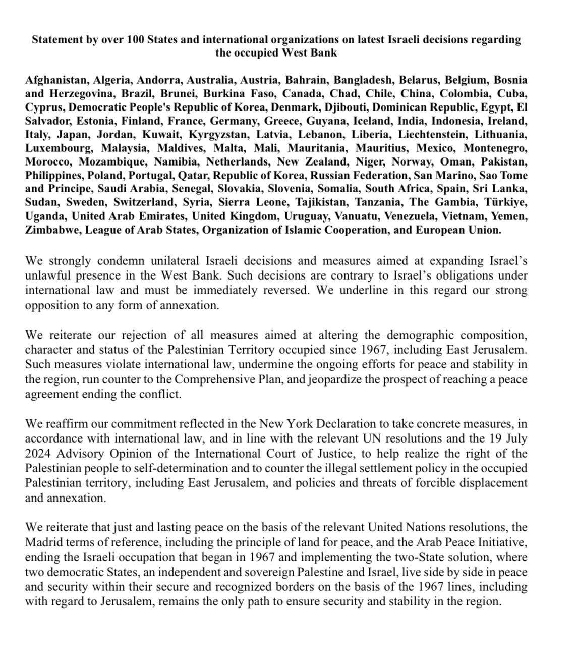 Asimismo, el documento recuerda la Opinión Consultiva de la Corte Internacional de Justicia del 19 de julio de 2024, que reafirmó la ilegalidad de los asentamientos y de cualquier intento de anexión.