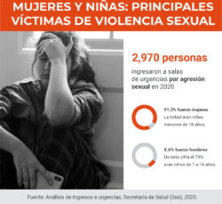 Su caso es apenas uno de los 2 mil 970 de abuso sexual que quedaron registrados en el acta de ingresos a urgencias de los hospitales públicos en medio de la pandemia por Covid-19, de los cuales 91.3% fueron niñas y mujeres. Un análisis de los datos abiertos de la Dirección General de Información (Dgis) de la Secretaría de Salud (SSa) revela que la mayoría de las víctimas mujeres que se registraron en 2020 tenían menos de 18 años.