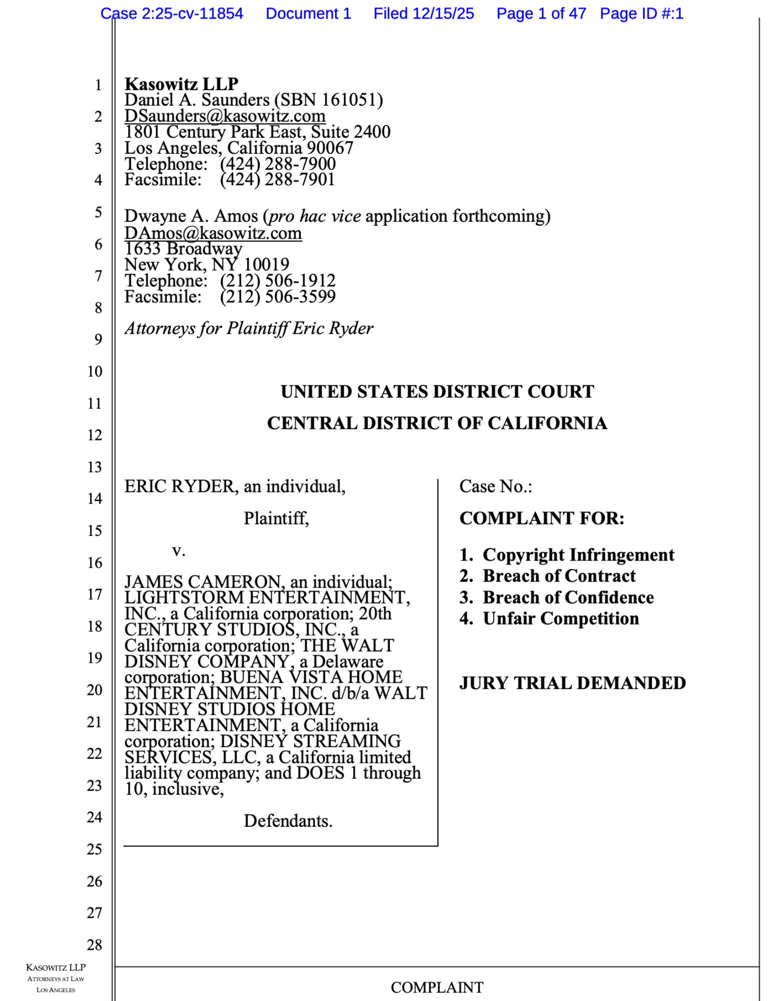 'La presunta apropiación indebida y el robo descarado del trabajo creativo protegido del señor Ryder por parte de los demandados para crear la tercera película más taquillera de todos los tiempos es flagrante y atroz, y pide a gritos una compensación', dijo el abogado del demandante.