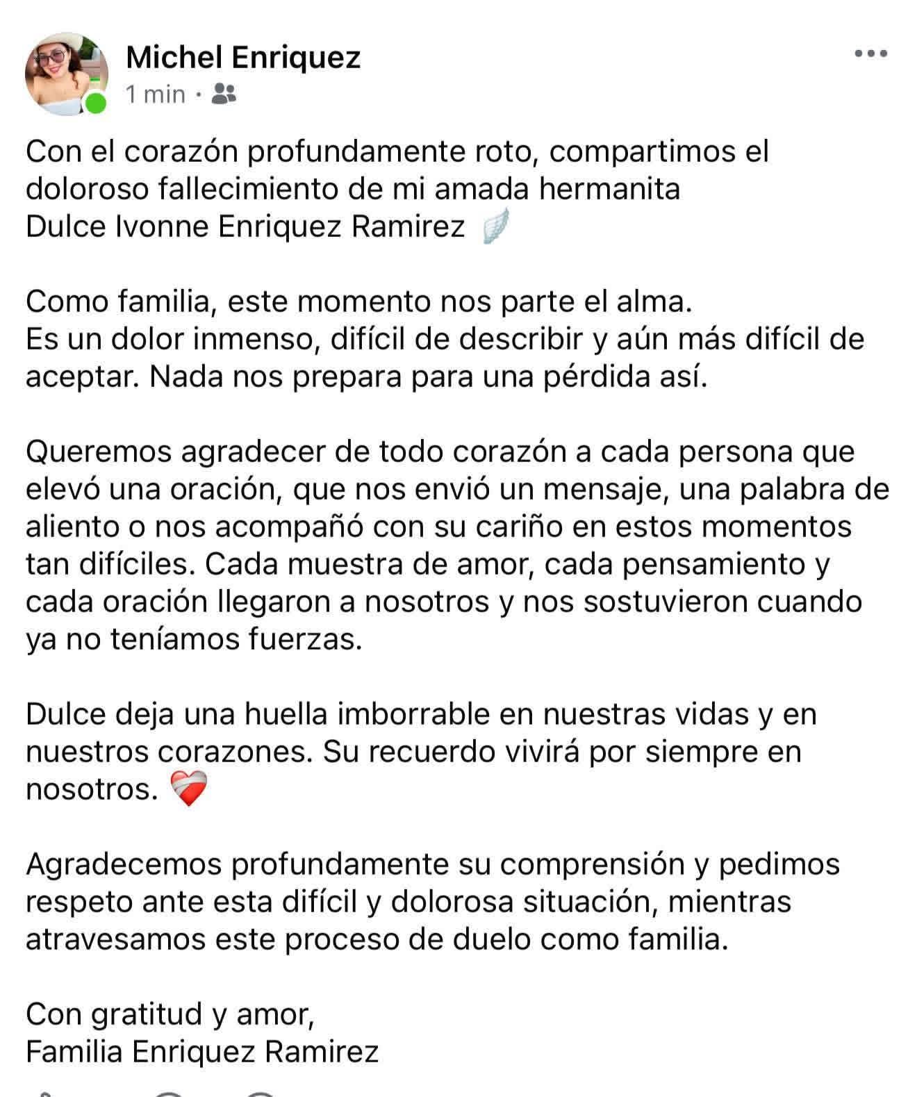 La hermana de la joven, Michel Enríquez, confirmó este lunes en redes sociales la noticia de su fallecimiento y la recordó como una persona inolvidable.