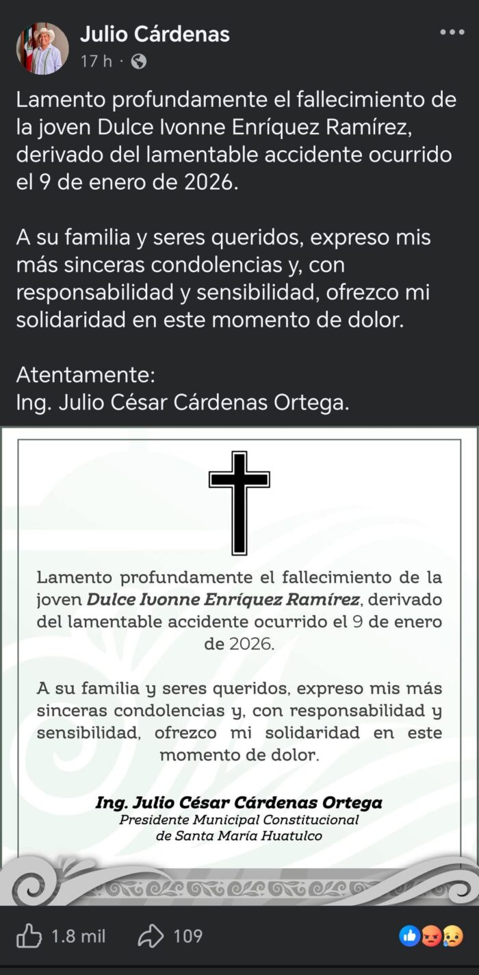 El alcalde de Huatulco, sin confirmar su ubicación, desde redes sociales lamentó el deceso de la joven y mencionó el accidente sin revelar detalles, ni responder al cuestionamiento de a quién pertenecía el vehículo, que podría estar relacionado con una televisora nacional.