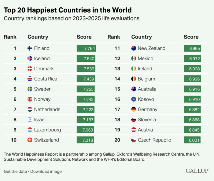 Costa Rica y México son los dos países de América con un mayor índice de felicidad y se ubican, respectivamente, en el cuarto y el décimo segundo puesto a nivel global, según el Reporte Mundial de la Felicidad de 2026, una clasificación anual de 147 naciones que vuelve a liderar Finlandia.