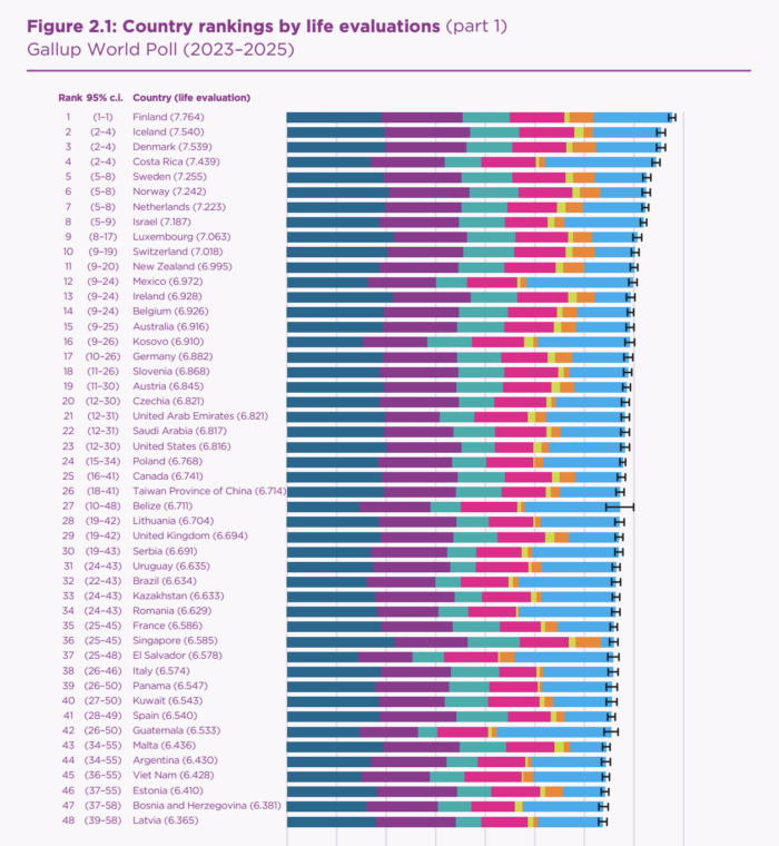 En la presentación de los resultados, investigadores latinoamericanos explicaron este viernes que Finlandia se sitúa en la primera posición por noveno año consecutivo, seguido de Islandia (2), Dinamarca (3), Costa Rica (4), Suecia (5) y Noruega (6).