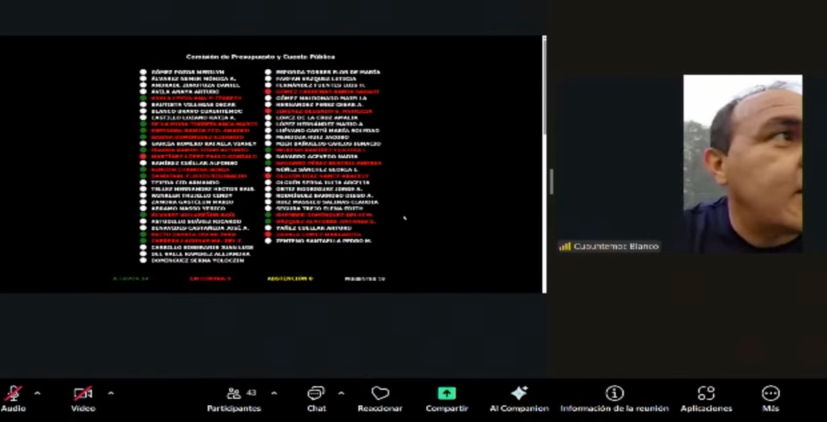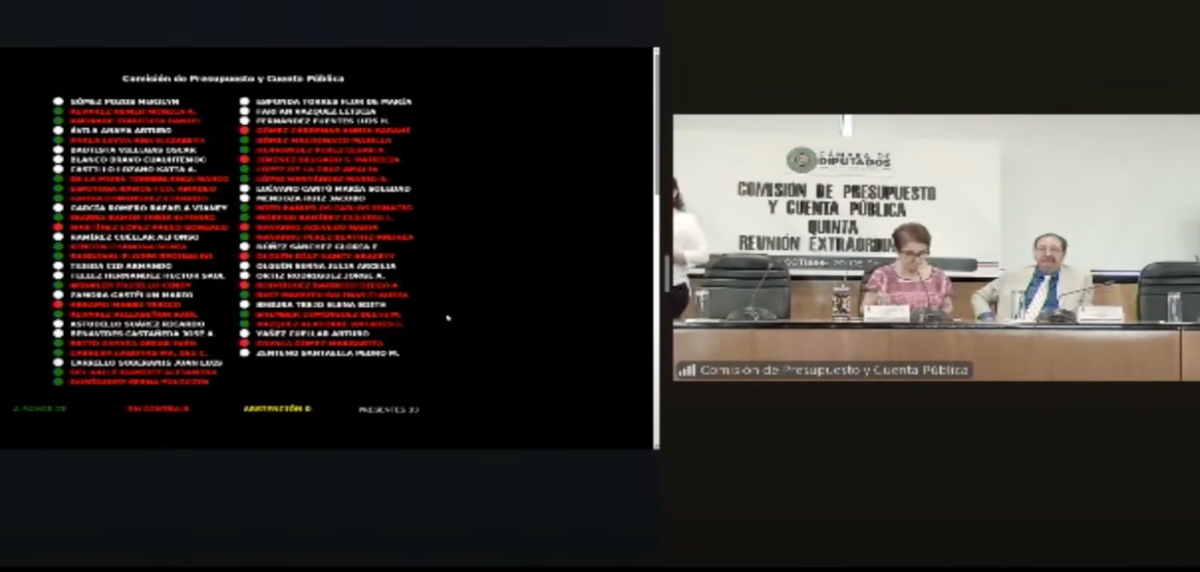 Mientras tanto, quienes se encontraban en el salón de la Comisión de Presupuesto y Cuenta Pública permanecieron conectados para concluir con la sesión y la votación. Blanco no se volvió a conectar.
