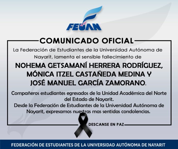 En un comunicado, la organización universitaria identificó a las víctimas como Mónica Itzel, Nohema Getsemaní Herrera y José Manuel, a quienes reconoció como “compañeros estudiantes egresados de la Unidad Académica del Norte del Estado de Nayarit”.