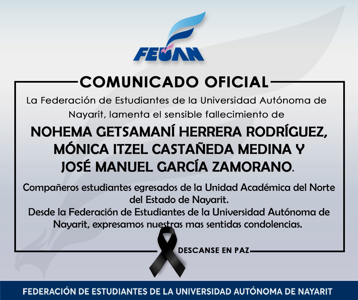 La Federación de Estudiantes de la Universidad Autónoma de Nayarit (FEUAN) expresó su pesar por la muerte de tres jóvenes en distintos hechos ocurridos en la zona norte del estado, entre los municipios de Acaponeta y Huajicori, y pidió a las autoridades esclarecer lo ocurrido.