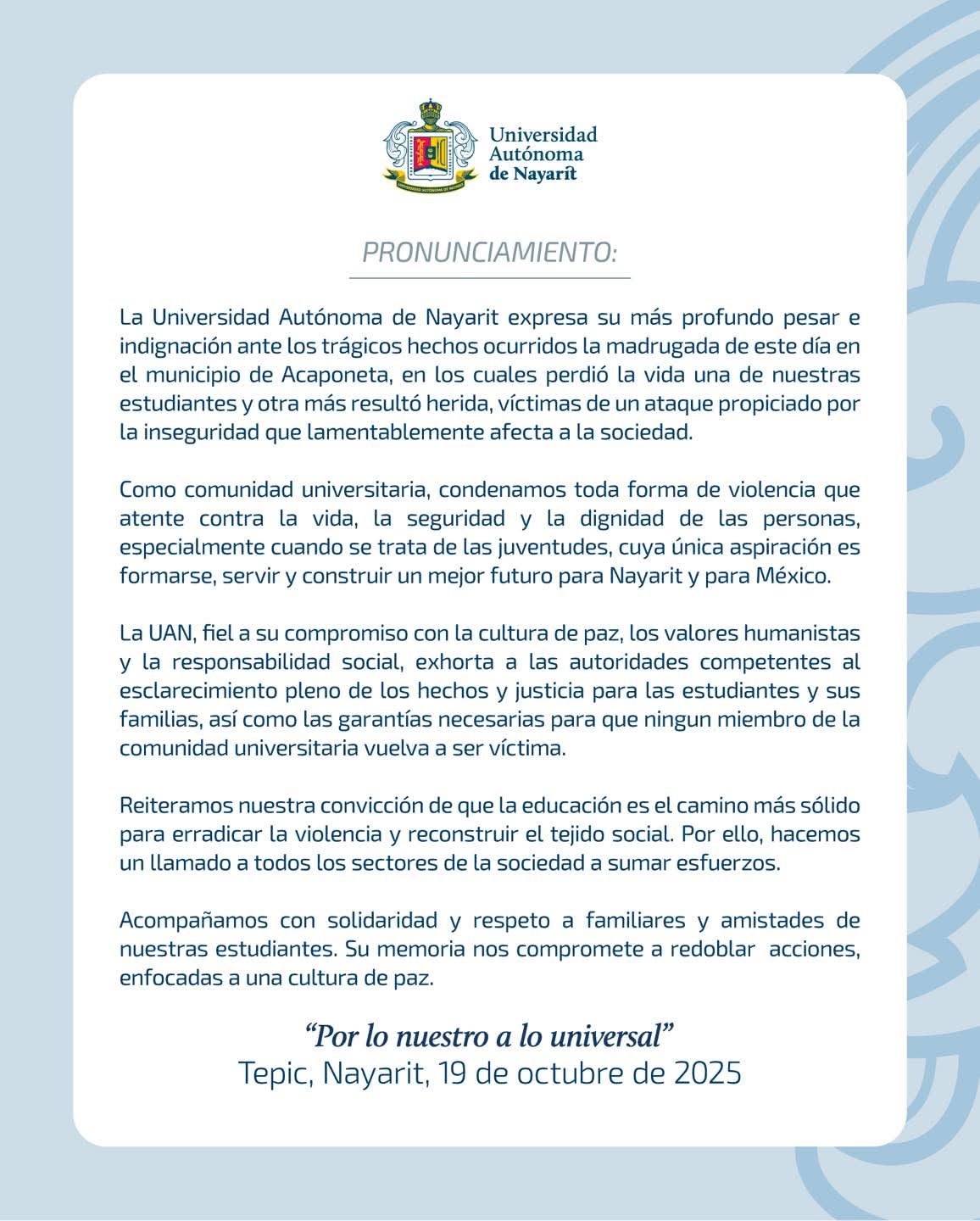 Por su parte, la Universidad Autónoma de Nayarit (UAN) publicó en un mensaje su “indignación ante los trágicos hechos ocurridos”.