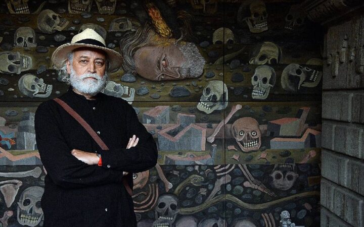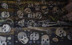 “A raíz de este nuevo descubrimiento comencé a pintar una larga hilera de cráneos pensando en estas dos realidades: un estado de luto permanente por los muertos de aquellos días de pandemia y en nuestro pasado prehispánico”, contó el artista durante la inauguración.