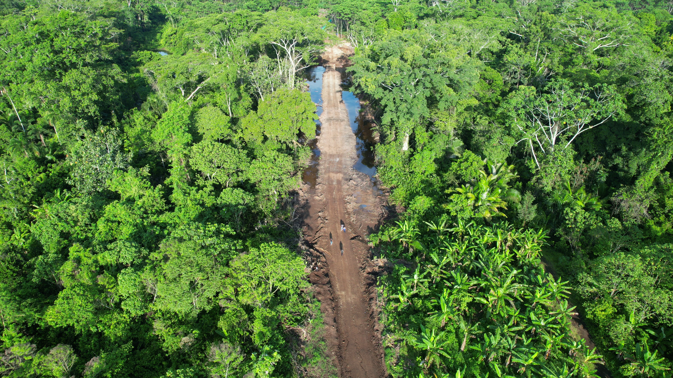 Una toma de dron muestra el cruce de la carretera en medio de zonas inundables. Foto: cortesía monitores comunitarios achuar para Mongabay Latam