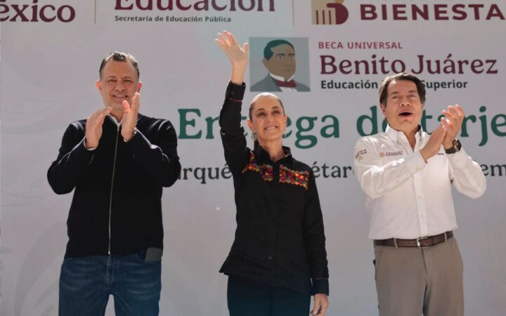 Desde el Marqués, Querétaro, donde entregó becas Benito Juárez a estudiantes, la mandataria federal hizo referencia a la construcción de escuelas medio superior y superior en el país, para que más jóvenes puedan estudiar sin necesidad necesidad de realizar un examen.