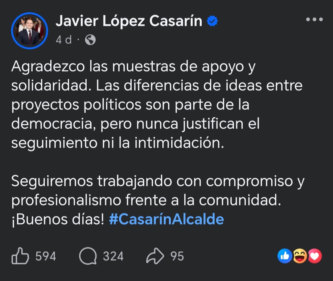 “Si lo que quiere hacer es críticas, con todo el gusto que las haga, pero no mande seguir al alcalde; estoy abierto al diálogo, pero no a normalizar el acoso o seguimiento de funcionarios por motivos políticos”, concluyó.